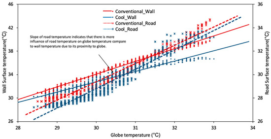 Figure 6 illustrates the results collected after sunset; there is a correlation between the globe and surface temperatures in regards to the trend in radiant temperature with respect to changes in the surface temperature (long wave emission) between the wall and road surfaces. In general, the temperatures of both the wall and road surfaces of the conventional canyon are higher than those of the cool canyon. The slope of change in GT with respect to the road surface temperature is higher than that of the wall temperature. As the globe sensor is positioned closer to the road than to the wall, a change in its surface temperature seems to be more sensitive to a change in globe temperature. It is also possible that there is a higher radiant heat loss from the pavement surface compared to the wall surface due to a higher sky view factor. The change in wall temperature, however, seems to have a greater impact in terms of the magnitude of the GT due to the higher wall surface area.