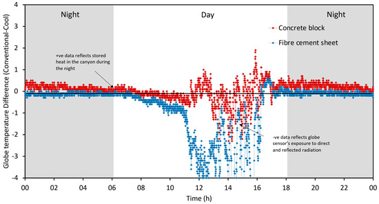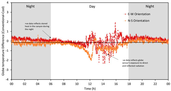 Figure 4 shows the difference in GT monitored between the low reflectance and high reflectance canyon models. A positive difference indicates that the low reflectance canyon resulted in a higher GT compared to that of the high reflectance canyon due to the higher absorption of solar radiation, which led to greater heat storage during the night. A negative difference during the day indicates that the high reflectance surface results in a higher GT due to exposure to solar radiation and reflection from surrounding surfaces (walls and roads). The orange and red colored lines in
