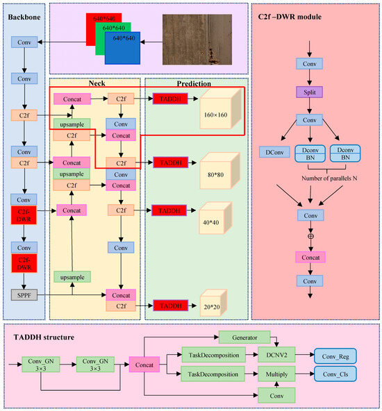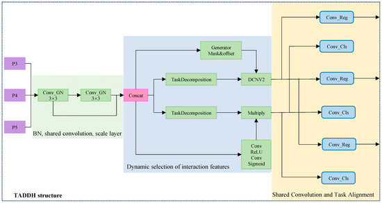 (2) Task-aligned dynamic detection head (TADDH) structure. Classification and localization tasks usually require different features, but traditional models may have conflicting feature selection between the two. The TADDH structure aims to select features dynamically, thus facilitating consistency between classification and localization tasks. This approach helps in ensuring that the model can optimize both classification and localization performance during the detection process.