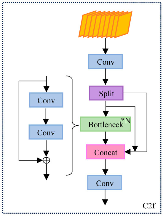 The Backbone part of YOLOv8 uses SPPF and C2f modules. The Channel through the Bottleneck input Tensor is split by 3 × 3 convolution, and the output is reduced to 0.5 times of the previous level, which increases the jump connections and significantly reduces the computational complexity, as well as enhances the sensitivity and accuracy of the details of the bridge disease. This is crucial for processing a large amount of image data and real-time detection. The specific structure is shown in Figure 2.