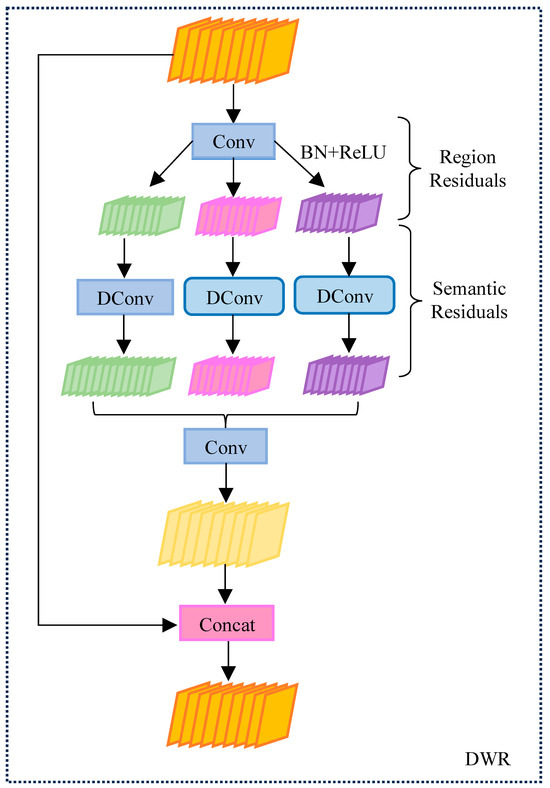 For this reason, the dilation-wise residual (DWR) structure is introduced into the C2f module. The DWR structure is shown in Figure 3. The core of the DWR structure is to utilize multi-scale extended convolution to capture contextual information at different scales. Different from the traditional extended convolution, DWR improves the accuracy of feature extraction through the ideas of regional residualization and semantic residualization. In this way, DWR can effectively avoid the limitations of traditional depth-space extended convolution when dealing with bridge diseases, especially in capturing multi-scale features.