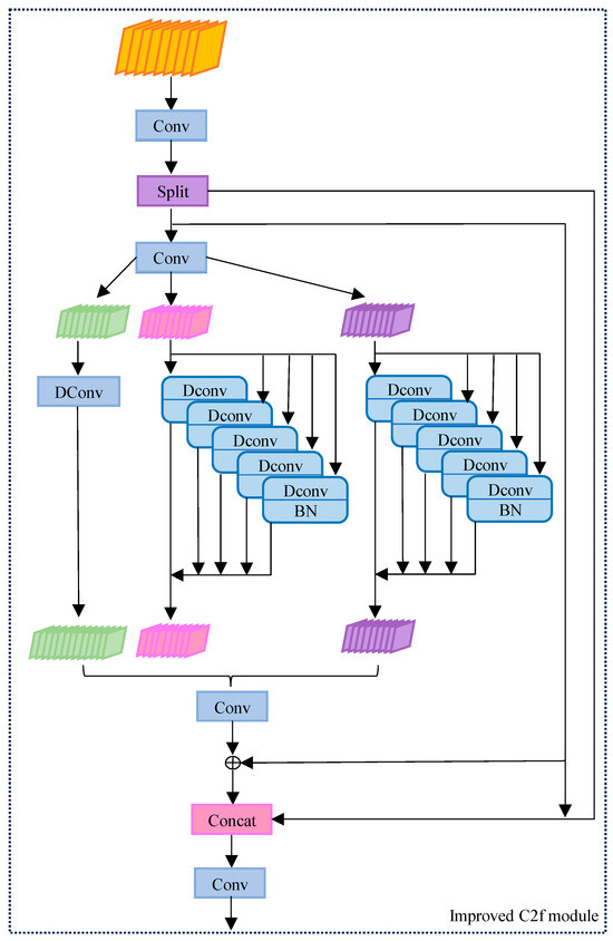(1) Improved C2f module. Traditional convolution modules may introduce computational bottlenecks when dealing with large-kernel convolution while making it difficult to effectively capture detailed information. The effect of large-kernel convolution is enhanced by introducing parallel dilution convolution and structural reparameterization. This approach helps in better handling the subtle differences between foreground and background and improving the prediction accuracy of the bounding box.