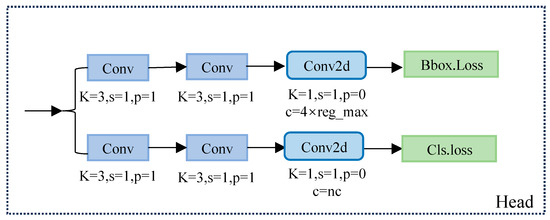 Specifically, it first branches through two CBS convolutional modules, which independently handle the classification and bounding box regression tasks. Next, a Conv2d layer is passed through to integrate the features and finally produce two independent loss values: classification loss and bounding box loss. The classification loss usually uses the binary cross-entropy (BCE) loss function, while the bounding box loss combines improved cross-parity ratio loss (CioU) and distributed focus loss (DFL) to measure the difference between the predicted frame and the true frame. The structure is shown in Figure 5.
