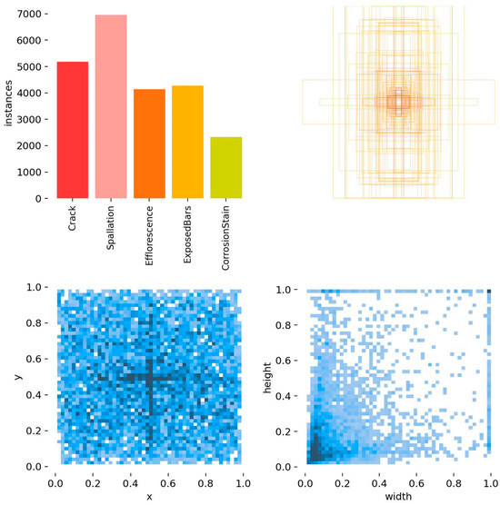 The base dataset in the experiment was the bridge disease public dataset CODEBRIM: Concrete Defect Bridge Image Dataset, published in 2019 for bridge concrete defect detection of multi-targeted diseases in computer vision and machine learning. The dataset contains five bridge defects: cracks, weathering, exposed reinforcement, corrosion, and spalling. A total of 1022 images and 5354 annotated disease bounding boxes are included. Data enhancement was performed on this dataset for sample expansion, and the expanded dataset totaled 4096 images, of which a total of 29,300 real disease boxes were labeled. The labeling types and the number and size of boxes are shown in Figure 8.