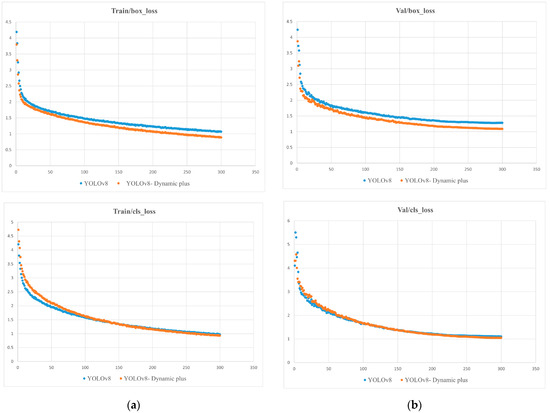 Comparison of YOLOv8 Dynamic Plus and YOLOv8 loss function curves: (a) Localization loss curves and classification loss curves in the training set; (b) verification of centralized localization loss curves and classification loss curves.