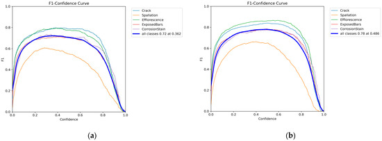 F1–confidence curves for five types of bridge disease: (a) YOLOv8 model; (b) YOLOv8 Dynamic Plus model.