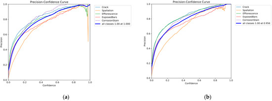 Precision–confidence curves for five types of bridge disease: (a) YOLOv8 model; (b) YOLOv8 Dynamic Plus model.