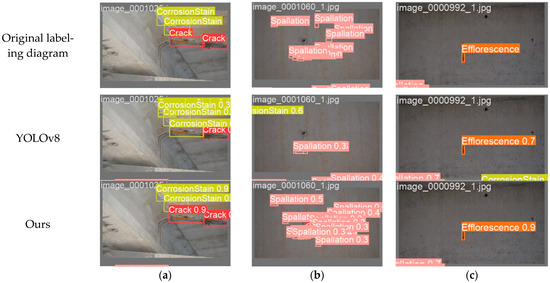 In Figure 12, we can see that the YOLOv8 Dynamic Plus model proposed in this study has a lower false-detection rate and lower leakage rate than the original YOLOv8 network, while the detection accuracy is higher than the original YOLOv8 network. This shows that the proposed network model can identify small lesions in bridge structures more accurately and reduce the missed detection rate. Small-target bridge diseases may be ignored or misjudged in daily inspection, but they are potential threats to the long-term safety of bridge structures. The improved model can more reliably locate and analyze distress and provide timely and accurate repair recommendations, which can help extend the service life of bridges and reduce maintenance costs.