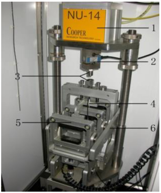 Cooper NU-14 test system (1. Pneumatic service loading device; 2. Force sensor; 3. Clamp joint; 4. Displacement sensor; 5. Four-point chuck; 6. Positioning plate).