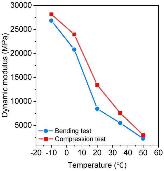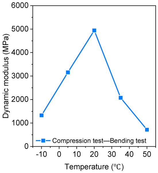 - The dynamic modulus ascertained via uniaxial compression tests exceeds that derived from bending tests; this disparity initially increases and then diminishes as temperature rises. At 20 °C, this discrepancy peaks, with a deviation of 58%.