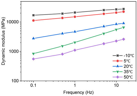 Specimens of the epoxy asphalt mixture with epoxy resin contents of 30%, 40%, 50%, and 60% were prepared using Gradation 1. A dynamic frequency scanning test was conducted at various temperatures using a COOPER testing machine. The test results of the dynamic modulus and phase angle are shown in Figure 10 and Figure 11.