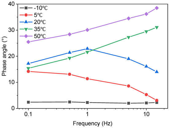 Figure 9 reveals that the phase angle of the epoxy asphalt mixture is significantly influenced by load frequency, initially rising and subsequently declining as frequency increases. At low frequencies and longer durations, the stiffness of the mixture is primarily governed by the embedded mineral skeleton, resulting in a smaller phase angle. Conversely, at high frequencies with brief action times, the mixture’s deformation is minimal, and external viscosity becomes less pronounced. In summary, the effect of load frequency on the phase angle of the epoxy asphalt mixture is different only in different frequency stages, which is obviously different from the dynamic modulus.