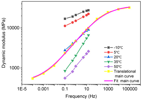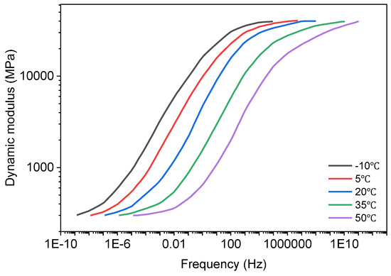 In the above Equation (4), there is only one unknown number Ts. By solving the quadratic equation about Ts, the fiducial temperature Ts corresponding to T ~ T0 is obtained. After the fiducial temperature Ts is obtained, Equation (4) is substituted to obtain the shift factor when the required temperature translates to the selected reference temperature T0. Meanwhile, the master curve can be obtained under the reference temperature condition. According to Equations (1) and (4), the reference temperature is selected as 35 °C, and the value of the fiducial temperature Ts is calculated inversely. Table 5 presents the detailed computation outcomes: