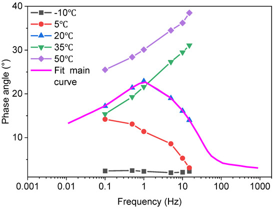 As depicted in Figure 6, the epoxy asphalt mixture exhibits a small and stable phase angle at −10 °C, indicative of robust elastic characteristics with minimal dependence on frequency. As temperature rises, the impact of frequency on the mixture’s phase angle intensifies. Specifically, at 5 °C, the phase angle diminishes with increasing load frequency, whereas, at 20 °C, it initially rises and subsequently declines. At higher temperatures of 35 °C and 50 °C, the phase angle consistently increases with frequency. In low-temperature settings, the asphalt binder significantly influences the mixture’s modulus. When the loading frequency is low (i.e., longer loading durations), the mixture displays pronounced viscosity, leading to an increase in the phase angle as frequency decreases. As temperature increases, the epoxy asphalt binder softens, diminishing its bonding strength with aggregates, thereby transitioning the mixture from elastic to plastic behavior. Under low load frequencies (longer action times), the rigidity of the mixture is largely governed by the embedded mineral aggregate skeleton, contributing to a smaller phase angle. Conversely, with higher load frequencies (shorter action times), the mixture exhibits enhanced hysteretic load response, equivalent to an enlarged phase angle, highlighting its more evident external delay in responding to load changes.