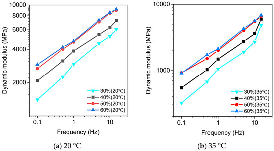 According to Figure 10 and Figure 11, under the conditions of 20 °C and 35 °C, the dynamic modulus of the epoxy asphalt mixture increases with the increase in epoxy resin content, and the phase angle decreases with the increase in epoxy resin content. This indicates that with the addition of epoxy resin, the crosslinked network structure of the mixture is enhanced, thus improving its strength, stiffness, durability, stability, adhesion, and other key performance indicators. The asphalt gradually changes from the original viscous material to the elastic material, and the viscoelastic property of the mixture is greatly improved. At the same time, when the epoxy resin content is 50% and 60%, the dynamic modulus and phase angle of the mixture have a small difference, but compared with the 40% content, the dynamic modulus of the mixture with 50% epoxy resin content is increased by 25.88% at 10 Hz and 20 °C, and by 34.48% at 10 Hz and 35 °C. The phase angle decreases by 58.04% at 10 Hz and 20 °C, and 36.23% at 10 Hz and 35 °C, showing better performance. Compared with the mixture with 60% epoxy resin content, the dynamic modulus only decreased by 1.45% at 10 Hz and 20 °C, and the phase angle only increased by 7.6%. Therefore, considering the influence of epoxy resin content on the performance of the mixture, combined with the actual situation such as the engineering cost, the epoxy resin content is recommended to be 50%.