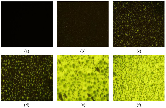 Fluorescence microscope photos: (a) 0%; (b) 10%; (c) 20%; (d) 30%; (e) 40%; (f) 50%.