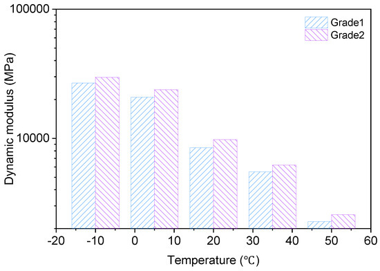 The test specimens were made with Gradation 1 and Gradation 2, respectively, and the test frequency was 10 Hz. Figure 13 presents the outcomes of the dynamic modulus testing. Gradation 1 is typically used as the lower layer of steel deck pavement due to its fine gradation, high asphalt content, and good fatigue performance. On the other hand, Gradation 2 is usually used as the upper layer of steel deck pavement because of its coarse gradation, large surface structure, and good anti-skid performance. As can be seen from Figure 11, coarse gradation has a higher dynamic modulus. Due to the fact that a coarse aggregate accounts for a larger proportion and a fine aggregate is less evenly distributed in coarse gradation, it is possible to form a better skeleton structure, which increases the friction force within the material. Hence, the coarse gradation asphalt mixture exhibits a higher dynamic modulus than the fine gradation counterpart.