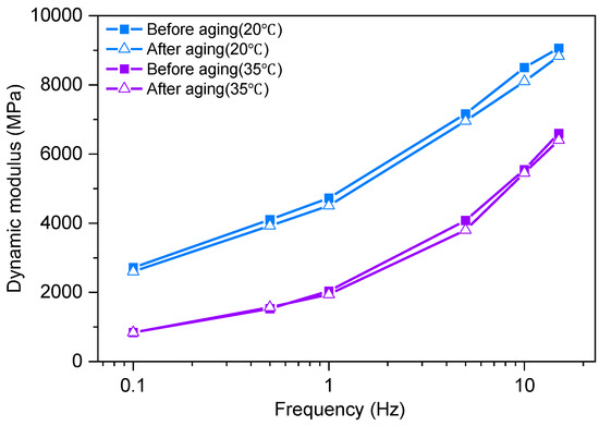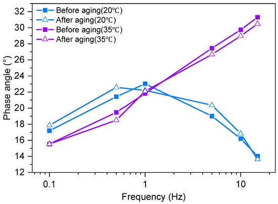 With the increase in service life of steel bridge deck pavement, pavement materials will continue to age, and its performance will also change accordingly. It can be seen that the anti-aging ability of pavement materials is an important factor affecting the service quality and life of pavement structures. The samples underwent a simulated long-term aging process in an oven at 85 °C for 5 days, mirroring the aging of real bridge deck pavement. Following this, a dynamic modulus scanning test was performed utilizing a COOPER material tester. Figure 14 and Figure 15 present the outcomes, revealing minimal changes in the dynamic modulus and phase angle of the epoxy asphalt mixture before and after aging. This stability demonstrates the excellent aging resistance of the epoxy asphalt mixture.