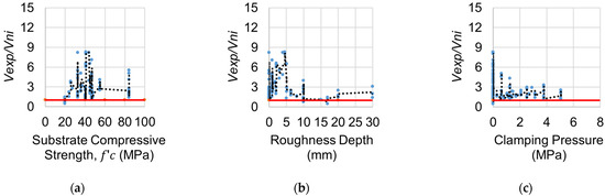 Despite the high variation of average strength at zero roughness, an almost constant average strength ratio was noted while observing the moving average line for UHPC–UHPC interfaces up to a roughness depth of 6.5 mm, after which it decreased (Figure 3). This can be observed from the results of the bin analysis as well (Table 4). This is consistent with the earlier result observed for the UHPC–concrete interface, where the average strength ratio decreased after 6.35 mm. However, the coefficient of variation of the average strength ratio was not as significantly high as for the UHPC–concrete interface in direct shear (Table 4). Apart from the results at zero clamping pressure, the average strength ratio variation with clamping pressure was around the ratio 3.0 (Figure 3). Significant conservatism of code was observed in the UHPC–UHPC interface for a specimen with zero clamping pressure. However, this conclusion needs to be verified by more experimental data.