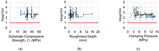 Four unconservative tests (<2.5% of total tests) were detected during the investigation of direct shear specimens in the UHPC–concrete interface data category (Figure 1 and Table 4). These test specimens had lower substrate compressive strength, higher roughness depth, and no shear connection between the interfaces. Higher roughness is associated with higher frictional force and an increase in the shear capacity. However, when no shear connector (or reinforcement) is present across the interface, concrete substrate strength becomes more important than surface roughness in determining shear capacity. Unsurprisingly, these specimens had substrate failure. However, no specimens with lower substrate strength failed in the slant shear test.