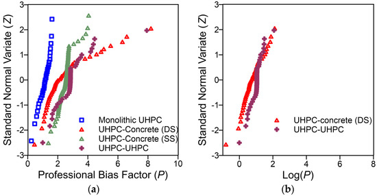 The value of the bias factor adopted for fabrication, , is 1.01 and the coefficient of variation is 0.04, also adopted from conventional concrete [34,35]. For the professional factor, the bias factor, , is calculated as the ratio of the experimental interface shear capacity to the nominal interface shear capacity determined from Equation (2) depending on the type of interface.