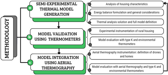 This proposal presents a gray-box model rooted in fundamental energy balance principles and enhanced with experimental data to predict the internal temperature of small, single-story dwellings based on external roof temperature measurements. Unlike similar models examined in previous research [39,41,42], which this study aims to complement, this model uniquely estimates indoor temperatures using external roof temperatures captured via aerial thermography. The following outlines the steps of the proposed methodology.
