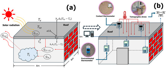 The energy balance of a house is modeled using a standard cubic framework, incorporating heat transfer through the building envelope, infiltration air flows, and internal heat sources [48,49]. Figure 2a shows the layout of a dwelling and its main energy flows, represented as a basic cubic structure to simplify the analysis. The aim of formulating this simplified model is to determine the internal temperature based on the external roof temperature of the house. Additionally, a specific instrumental design has been used to validate the proposed model, as depicted in Figure 2b.