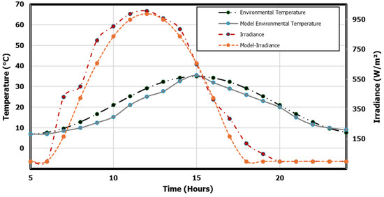 The experimental validation of the model was conducted in two indigenous communities in Michoacán: Pichátaro and Carapan. The experiments were carried out in March and April 2024, under conditions of average solar insolation of 5.2 kWh/m2 and daytime ambient temperatures peaking at 25 °C. Each community underwent two weeks of measurements. Ten houses were analyzed—those with concrete roofs in April and those with asbestos sheet roofs in March. The ambient temperature was modeled as a sinusoidal function according to Equation (10). Figure 3 illustrates the variations in ambient temperature and solar irradiance throughout a typical day during the measurement period. The graph demonstrates that the modeled ambient temperature closely aligns with experimental measurements, confirming consistency between the theoretical model and the observed results.