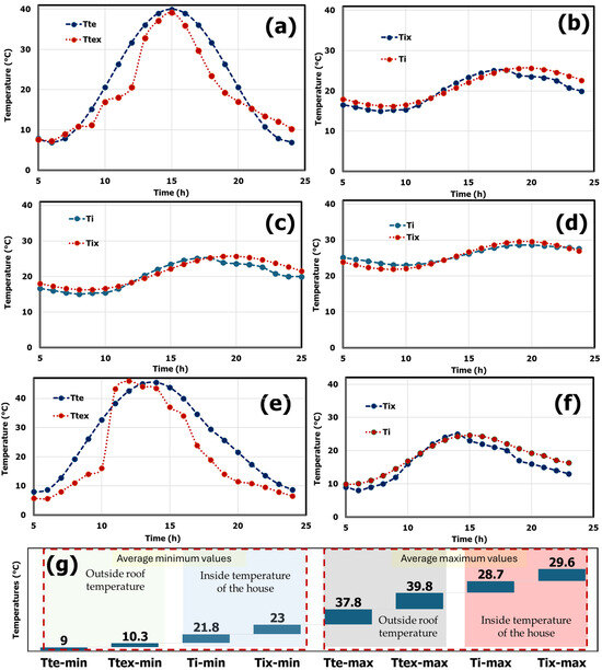 Model validation. Temperature variation in concrete-roofed houses: (a) outside during March, (b) inside during March, (c) outside during April, and (d) inside during April. Temperature variation in houses with asbestos sheet roofing: (e) outside in March and (f) inside in March. (g) Average temperature differences between model and experimental data during March and April for concrete-roofed houses.