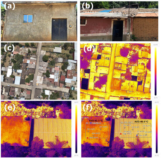 Models of analyzed houses: (a) with concrete roofs and (b) with asbestos roofs. Thermographic analysis: (c) identification of the distribution of houses, (d) aerial tomography of the distribution of houses, (e) thermography in houses with concrete roofs and asbestos sheets, and (f) processing of the thermographic analysis.