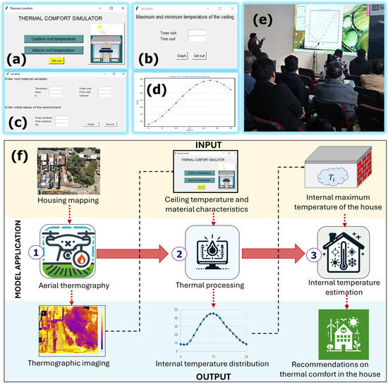 Interface of the developed software: (a) main input, (b) declaration of temperature variables, (c) definition of material properties, and (d) results graph. (e) Delivery and explanation of the operation of the software. (f) Integrated diagram of the application of the thermal model.