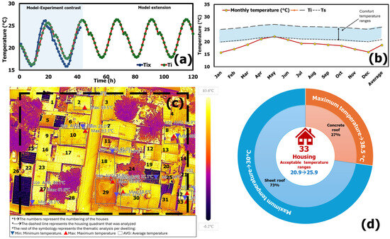 Scope of the thermal model: (a) projection of the model with initial data, (b) graphical analysis of the comfort temperature range in Pichátaro, (c) application of thermographic analysis for estimating comfort temperature ranges, and (d) percentage distribution by temperature range of houses.