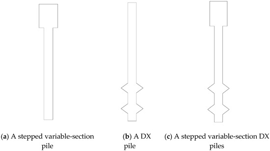 Figure 1a shows a stepped variable-section pile. Variable cross-section piles have an obvious squeezing effect on the soil layer during settlement, increasing the pile’s lateral friction resistance [16,17]. When the pile is under pressure, the step form can play a certain bearing role in each soil layer, and then, combined with the pile end grouting process, it can improve the bearing performance of the pile. Variable cross-section form fully applies the axial force of the pile body gradually decreases from top to bottom under vertical load, and the distribution law of bending moment shear force under transverse load is also big at the top and small at the bottom, so as to save the material used for the pile body and reduce the cost of the project. Figure 1b shows a DX pile. DX piles can greatly increase the single-pile bearing capacity because the load-bearing plate improves the contact area between the pile body and the soil, which enhances the bearing performance, and the rotary excavation and squeezing and expanding equipment has the effect of squeezing and compacting the soil around the pile.