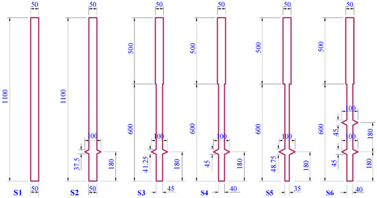 The model design first observed the condition of geometrical similarity according to the actual engineering needs and then integrated the difficulty and cost of the test production, the actual conditions of the production equipment, the accuracy requirements of the test measurements, and other aspects of the considerations, which can ensure the accuracy of the test piles. Piles S1–S5 were from reference [30], and one pile, S6, was the experimental model in this study, which was made in the same batch as piles S1–S5. The diameter of the piles body was 50 mm, and the length of the piles was 1100 mm. The diameter of the load-bearing plate was 100 mm. The variable ratio b is the ratio of the lower pile diameter to the upper pile diameter. The location of the variable section was 500 mm from the top of the pile. The variable section pile adopted a stepped pile type. The number of load-bearing plates was 2 for pile S6, 1 for piles S2–S5, and 0 for pile S1. The position of the load-bearing plate of the pile S6 was 180 mm and 360 mm from the bottom of the pile. The parameters of the test piles are shown in Table 2. The material parameters of each pile body are shown in Table 3. Figure 3 shows the design drawing of piles S1–S6.