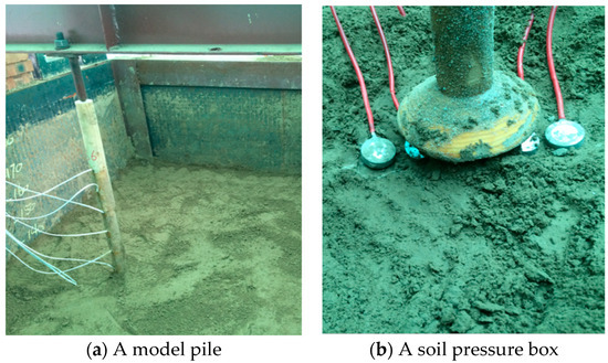 The soil was first filled to a predetermined pile end height location. Then, the model pile was placed and secured at the designated location, and then the soil fill was continued to a predetermined pile top height. The model pile and soil pressure box were buried, as shown in Figure 4.