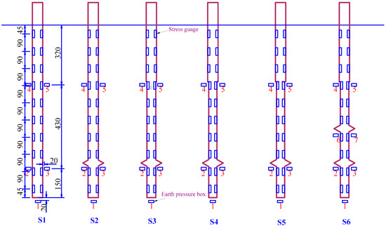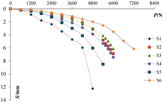 Load–settlement curves of piles S1–S6 are shown in Figure 7. Compared with the equal-section pile, the DX piles were obviously stronger in terms of settlement control. The presence of the load-bearing plate made the contact area between the pile and the soil body increase, and the lateral friction resistance of the pile body was greatly increased, thus increasing the bearing capacity of the pile. In the early stage of loading, when the load on the top of the pile was small, the settlement of stepped variable-section DX piles was similar to that of the equal section pile, and the advantages of stepped variable-section DX piles were gradually revealed with the increase of the load.