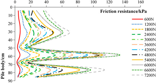 Figure 8 shows the distribution of lateral friction resistance of pile S6. Compared with pile S4 in reference [30], variable section S6 pile had two load-bearing plates, and its lateral friction resistance was fully exerted. The sudden change of lateral friction resistance at the bearing discs can illustrate the great role of the bearing plate in the bearing of the pile body. With the gradual increase of loading, the relative displacement between the pile and the soil was also increased, the lateral friction resistance became larger, and the bearing plate was more fully utilized. When the pile settlement reached a certain level, there was a gap between the pile and the soil, and the soil was loosened, resulting in less lateral friction resistance at the top of the load-bearing plate.