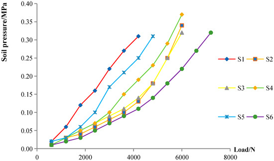 Figure 9 shows the variation curves of soil pressure at the pile end under vertical loading. Under the same vertical load, the soil pressure at the pile end of equal-section pile S1 was larger than that of DX piles S2–S6. The friction resistance of the pile body and load-bearing plate resistance of the DX pile bear a large portion of the pile body, which played a great role. The soil pressure at the pile end was very small, which can effectively control the settlement at the pile end. Among the various DX piles, the S6 pile had two load-bearing plates. Its soil pressure at the end of the pile was the smallest, and the advantage of settlement control was obvious. The soil pressures at the end of piles S2, S3, and S4 were small, indicating that a reasonable variable section was favorable to the bearing capacity of the piles. Pile S5, with a smaller b value, had larger soil pressure at the pile end and an obvious loss of bearing capacity.