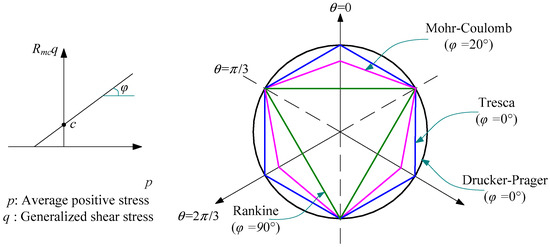 As shown in Figure 10, the friction angle φ also indicates the shape of the yield surface of the material on the π-plane, and when φ = 0°, the Mohr–Coulomb model is transformed into the Tresca model, which is independent of the peripheral pressure, and at this time, the yield surface on the π-plane exhibits an ortho-hexagonal shape. At φ = 90°, the Mohr–Coulomb model is transformed into the Rankine model when the yield surface of the π-plane presents a positive triangle and Rmc → ∞. If 0° ≤ φ ≤ 90°, then the yield surface presents a hexagonal shape with equal sides but not equal angles, which is called the Mohr–Coulomb hexagon.