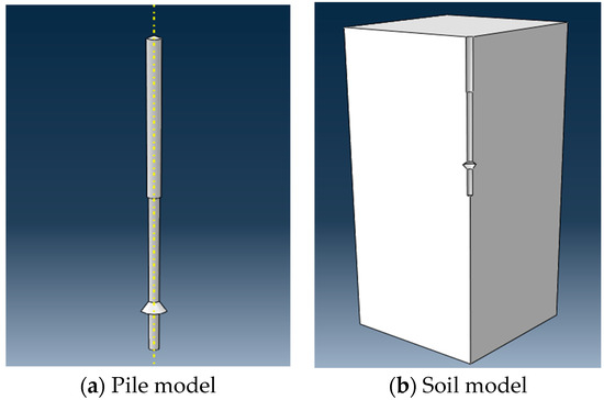 According to the actual dimensions of the pile and the soil body of the model test, the soil body around the pile was a rectangular body of 1.8 m × 1.8 m × 2 m, the outer diameter of the pile body was 0.05 m, the length of the pile was 1.1 m, and the depth of the pile below the soil layer was 0.9 m. The model with 1/4 symmetry was established. The pile body was modeled as shown in Figure 11a. The model space was selected as three-dimensional (3D), and its type was deformable. The shape in the basic features was selected as solid and its type was rotated. The model space of the soil body was also selected as 3D, and its type was deformable. The shape in the basic features was selected as solid and its type was stretched. The soil body of the rectangular body was modeled, and then the geometric elements were split to divide the soil part where the pile was located, and the soil body was established, as shown in Figure 11b. A linear elastic model was used for the pile, and an isotropic elastoplastic body was selected for the soil. The material modeling parameters of the pile and soil are shown in Table 1 and Table 3.