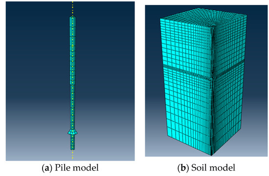 After defining the material properties of the parts, they were assembled in the assembly module, where the parts were assembled into a whole by means of different positioning relationships. The contact module was utilized to define the contact units. Face-to-face contact was selected to create contact surfaces for each component, and then a master–slave algorithm was used to create contact pairs. A softer soil material was selected for the follower surface. The soil surface and the pile surface were set up as bound lifts that would not be displaced relative to each other. ABAQUS software has three main meshing techniques: free meshing, structured meshing, and swept meshing. Both the pile model and the soil model were meshed by the swept mesh technique using linear C3D8R units. The meshing was completed, as shown in Figure 12. Applying loads and boundary constraints was performed in the loading module. The boundary conditions for the numerical model were vertical displacement and bottom radial selection constraints for the soil model, and radial displacement selection constraints for the side parts of the soil model. To study the stress–strain relationship of the model, the magnitude curve should be added after selecting the load type. The type of the curve was a tabular magnitude curve, which determined the increase of the load at each time point, and the size and sequence of loading were based on the experimental pile.