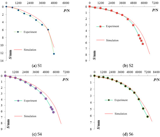 Numerical simulation analysis was conducted on the equal-section pile S1, the DX pile S2, and stepped variable-section DX piles S4 and S6. Figure 13 shows the comparison of experimental and numerical simulation load–settlement curves. The experimental values and simulation values of the ultimate load existed within a certain allowable error; this was because the numerical simulation of the parameter value was generally idealized, while in the actual experiment, there were many uncontrollable factors, such as uneven soil layer densities, etc., which caused errors, but the experimental and numerical simulation load–settlement curves overlapped. The experimental and numerical simulation ultimate loads were compared in Table 7. From Table 7, it can be seen clearly that the relative errors of the numerical simulation results were below 10%, which validated the accuracy of the finite element model.