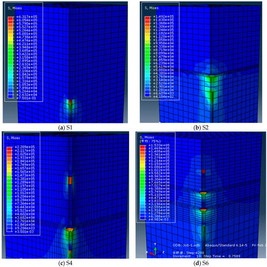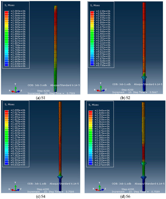 When the vertical load at the pile top was 4.2 kN, the stress cloud of each pile body was simulated, as shown in Figure 14. Under vertical pressure, the stress of the equal-section pile S1 gradually decreased from top to bottom, the stress of DX pile S2 also decreased from top to bottom, and the decrease at the bearing plate was obviously accelerated, indicating that a large portion of the load was transmitted to the soil around the pile through the bearing plate. Variable-section piles S4 and S6 had reduced cross-sectional area at the variable section and higher stresses, and the stress decreasing above and below their load-bearing plates was obvious. Compared with the equal-section pile S1, the axial force in the area below the bearing plate of the variable cross-section DX pile was extremely small, indicating that most of the load had been transferred to the soil around the piles, and the soil pressure at the bottom of the piles was small, which can effectively control the settlement of the piles, and reflected the advantages of variable cross-section DX piles in bearing.