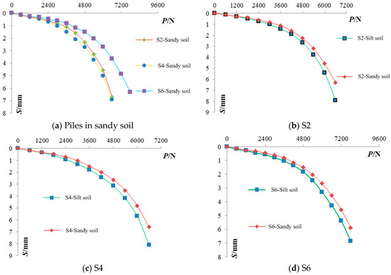Various parameters of the soil were varied to simulate and analyze the pile-bearing process in different soil layers. The parameters of silt soil and sandy soil are shown in Table 8. The load–settlement curves of piles in pulverized soil and sandy soil are shown in Figure 16. The settlement of pile S4 was the largest in the preloading period, and that of pile S2 was accelerated in the later period. There was not much difference between the two ultimate loads. The bearing capacity of stepped variable-section DX piles in sandy soil was stronger than that in silt soil. The settlements of the three-stepped variable-section DX piles in sandy soil were smaller than those in silt soil, indicating that the piles were more effective in resisting compressive bearing in sandy soil than in pulverized soil.