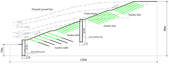The Nankun Railway, known as the Southwest Artery in China, was designed and constructed in the 1990s. It stretches from Nanning in the east to Kunming in the west, passing through several expansive soil zones along its route [4]. Due to insufficient attention being paid to expansive soil during construction, the Nanning Railway Bureau has invested over hundreds of millions of USD over ten years to address 551 cases of embankment disorders along the 110 km stretch from Nali to Baise. This included issues such as side ditches being squeezed into narrow gaps and sheared-off anti-sliding piles. Among these cases, a particularly representative incident occurred at Linfeng Railway Station, which is situated on a slope composed of expansive soil. Here, the embankment experienced repeated landslides, necessitating subsequent remedial measures and resulting in three cumulative modifications of the slope protection schemes [5]. Such repeated landslides and remediation efforts have not only resulted in significant financial and manpower losses, but have also posed threats to railway operations safety. To ensure the operational safety of the railway, railway authorities eventually adopted a combination of pile–soil walls and anchor rods (cables) with grid beam structures to reinforce high slopes of expansive soil. However, determining the distribution of internal forces on such combination support structures is of significant reference value for slope reinforcement.