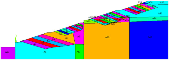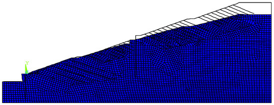 The simulation of the on-site slope (Figure 1) was conducted using the general finite element software ANSYS 2020, and the constructed model is depicted in Figure 2. For elongated entities like slopes, the computational model can be simplified into a plane strain problem. Assuming that the external forces acting on the slope do not vary along the Z-axis, and that displacement and strain occur within the plane of the slope itself, the slope soil can be considered as a plane strain problem during modeling.