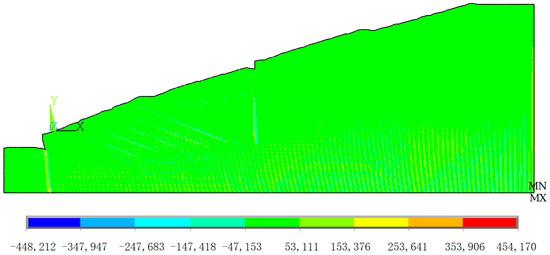 The X-direction principal stress diagram is shown in Figure 4. It indicates that the principal stress in the X-direction represents the component of landslide thrust. The areas with larger values are mainly concentrated at the upper and lower piles and pre-stressed anchor rods. This implies that the piles and anchor rods are the main structures resisting landslide thrust. There are also regions of significant X-direction thrust at the bottom of the model, caused by the constraints applied in the X and Y directions of the slope model.
