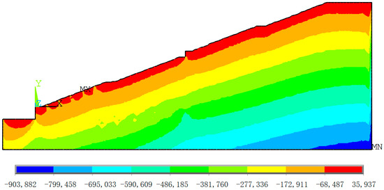 Figure 5 illustrates the Y-direction principal stress contour. The Y-direction principal stress is layered and transmitted downward, with the stress contour lines bending around the piles and anchor rods. This indicates that the presence of piles and anchor rods influences the distribution of Y-direction principal stress.