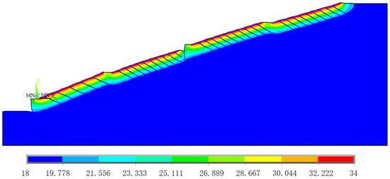 The application of the expansive load on the slope is simulated using the ANSYS thermal–structural coupling module. The natural water content of the slope soil is 18%, and, after rainfall, the surface soil becomes saturated with a water content of 34%. The range of rainfall influence is 4 m (atmospheric influence depth), and the thermal expansion coefficient of the expansive soil is 9 × 10−5. Thus, the temperature field simulating the humidity field formed by rainwater infiltration is shown in Figure 9 and Figure 10.