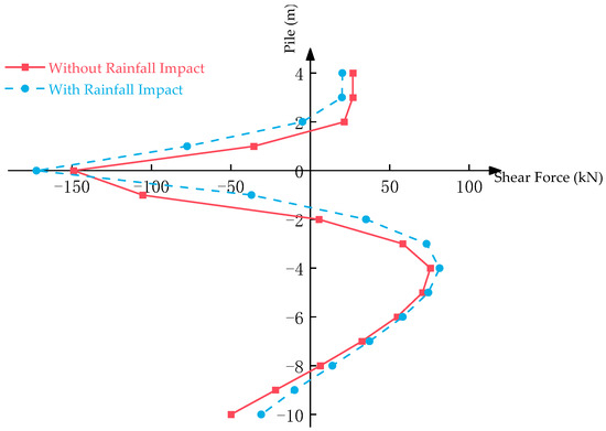 Figure 11 illustrates the shear forces in the lower pile with and without considering rainfall. It can be observed that the shear force in the cantilever section gradually decreases along the pile, while, in the anchored section, it initially increases and then decreases. The maximum absolute value of the shear force in the lower pile occurs 4 m below the top of the pile, precisely at the junction of the cantilever and fixed ends, with a maximum value of 149.65 kN. Considering rainfall, the maximum shear force increases to 158.34 kN, and the maximum value still occurs at the same location. Rainfall has a significant impact on the shear forces in the lower pile. After introducing rainfall conditions, the shear forces at both ends of the lower pile decrease to some extent, ranging between 25.75% and 38.08%. However, there is a noticeable increase in shear forces in the middle section of the lower pile (within 3 to 12 m from the top of the pile), with the most rapid increase occurring around 3 m from the top, at approximately 42.0 kN, representing a 118.31% increase.